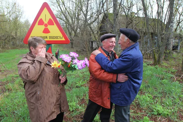 Чернобыль, 29 жыл өткөндөн кийин. Курчоого алынган аймактан көчүрүлгөн жарандарга таштап кеткен үйлөрүн көрүүгө уруксат берилди. Алар Дернович айылында жолугушту.