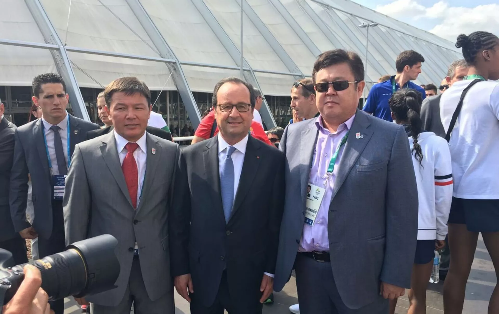 Анда дзюдочу Юрий Краковецкий казакстандык спортчу менен турганы, Жаштар иши, дене тарбия жана спорт боюнча мамлекеттик агенттиктин башчысы Канат Аманкулов менен Улуттук Олимпиада комитетинин президенти Шаршенбек Абдыкеримовдун Франция президенти Франсуа Олланд менен түшкөнү тартылган.