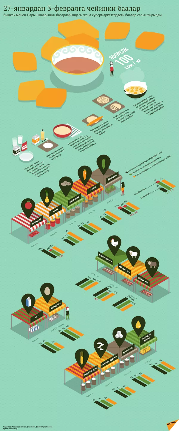 Бишкек менен Нарын шаарынын базарларындагы азык-түлүктүн баасы канчадан болуп жатканын инфографикадан караңыз.
