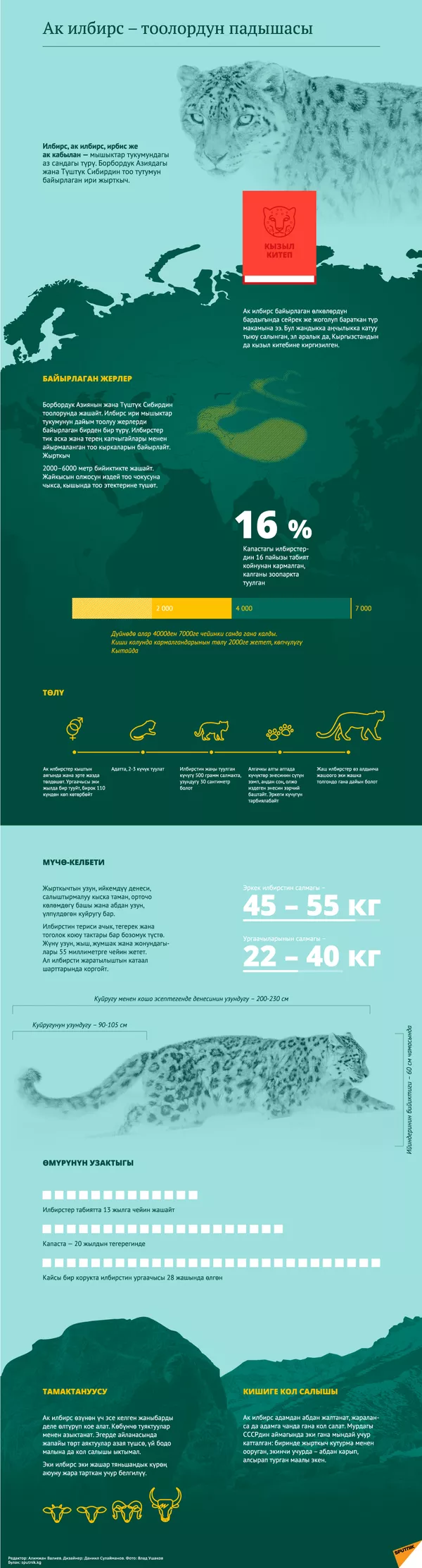 12:23 18.08.2017 (Жаңыртылды: 21:59 15.12.2021) Ак илбирс тоолуу Кыргызстандын башкы символу. Бүгүнкү күндө дүйнө жүзүндө 4000ден 7000ге чейин гана түрү калды. Ак илбирсти сактоо боюнча саммитти утурлай Sputnik Кыргызстан бул сындуу жаныбардын жашоосундагы башкы нерселер чагылдырылган инфографиканы сунуштайт.