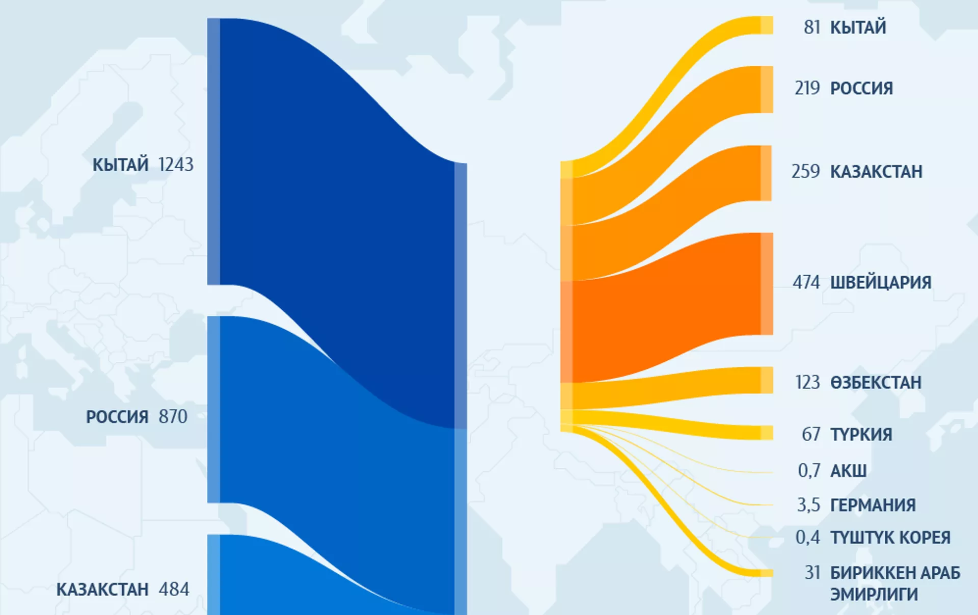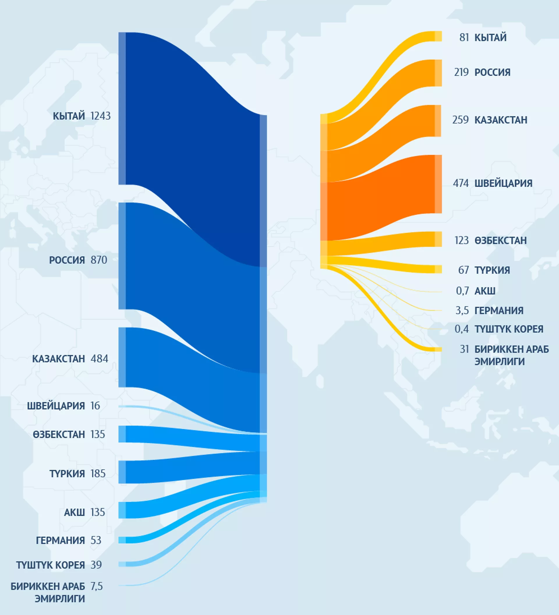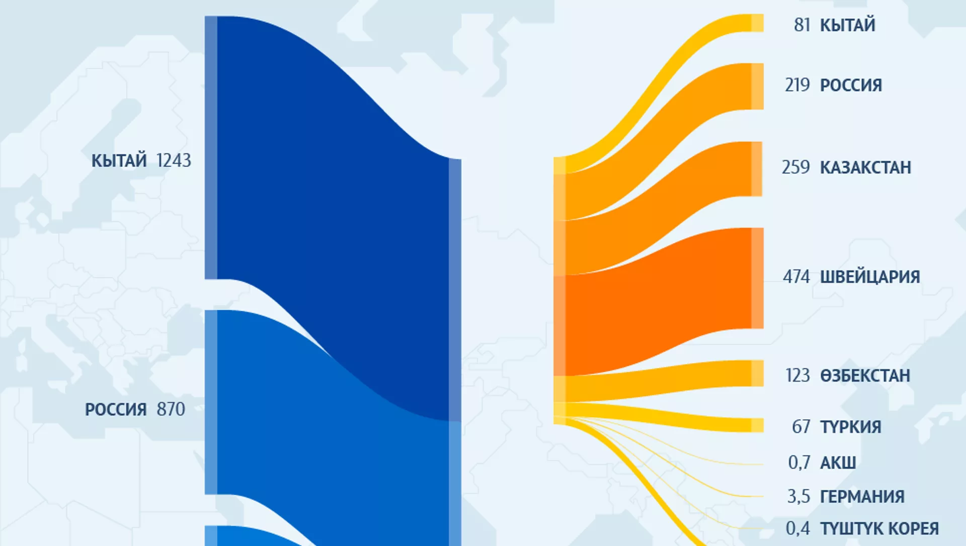 Төрт жыл ичинде бир катар өзгөрүүлөр болгон. Буга чейин биринчи орунда Россия болсо, учурда алдыга Кытай чыкты.
