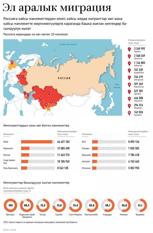 Ага ылайык, иммигранттар АКШда (46 миллион 627 миң 102 киши) басымдуулук кылат, андан кийин Германия (12 миллион 5 миң 690), үчүнчү орунда Россия (11 миллион 643 миң 276 киши) турат.