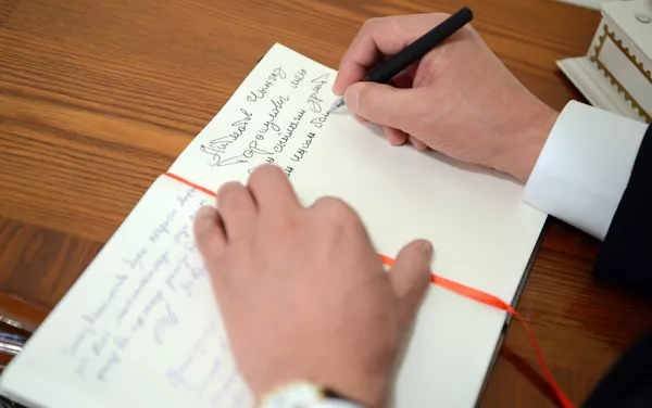 Президент Айтматовдун үй-музейиндеги эскерүү китебине жазуу калтырып, улуу адамдын жакындары менен сүрөткө түштү.