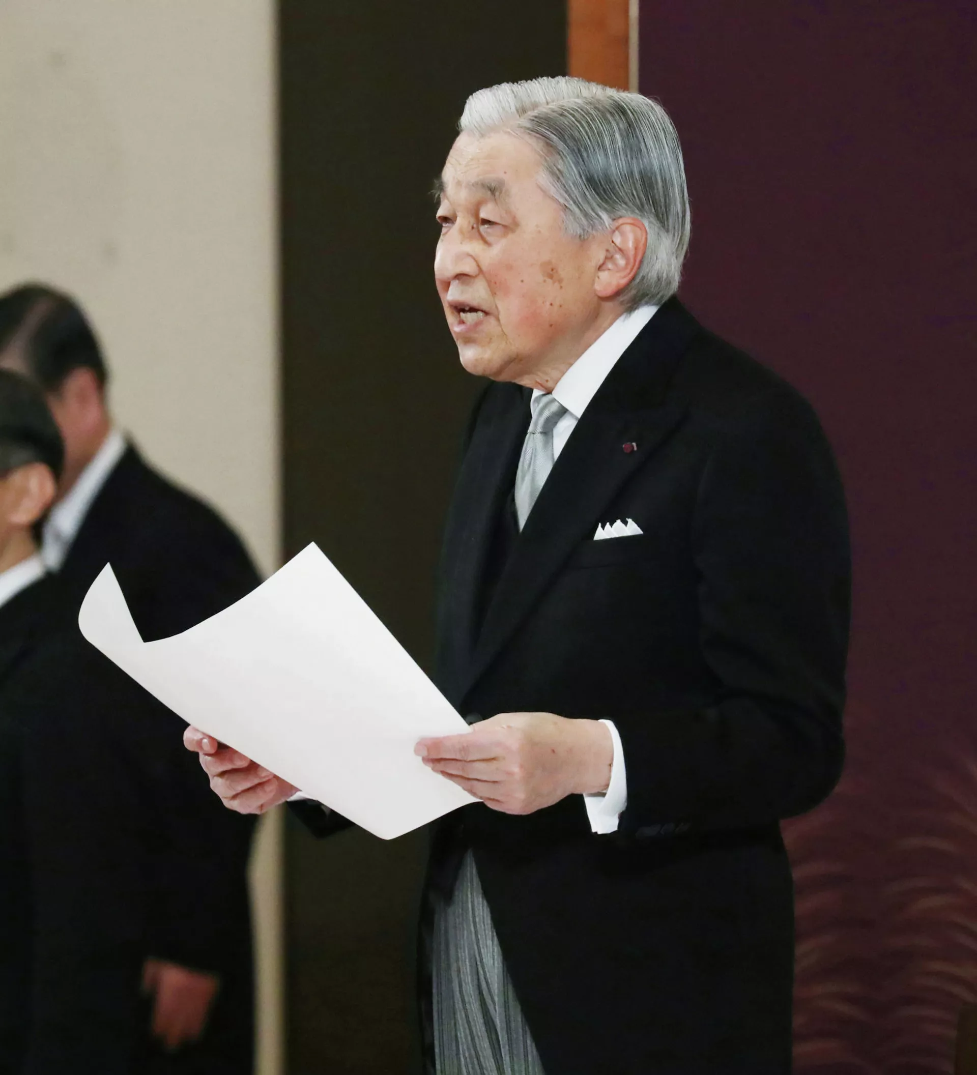 Императордун кетишине байланыштуу уюштурулган атайын иш-чара анын "Сайдэн Мацу-но-ма" сарайында өтүп, салтанатты өлкөнүн бардык телеканалдары чагылдырды. Сарайда император Акихито жубайы менен, мураскери Нарухито жубайы менен, императордун үй-бүлө мүчөлөрү жана бийликтин үч бутагы — жалпы 300 адам болду.