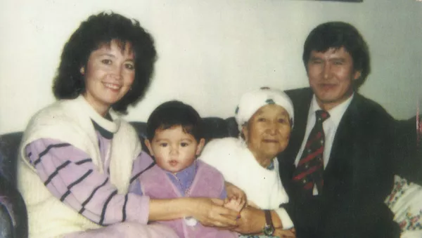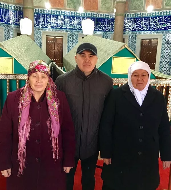 © Фото / из личного архива Алтынбека Сулайманова "Бир бол" фракциясынын лидери Алтынбек Сулайманов жана апасы Паизкан Сулайманова (оң жакта, ак жоолукчан). Депутаттын апасы былтыр 72 жашында каза тапкан.