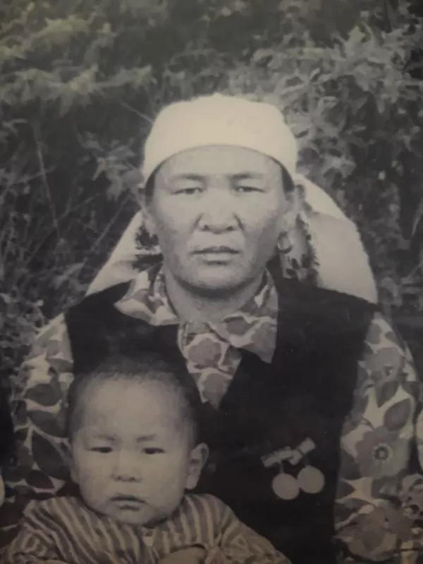 © Фото / Абылгазиев Эрчинбек Жогорку Кеңештин депутаты Рыскелди Момбеков апасы Айымкүл Кадыркул кызы менен. Апасы анда 38 жашта болсо, болочок эл өкүлү 1 жашта экен.