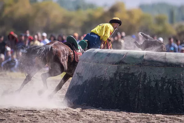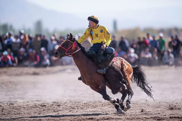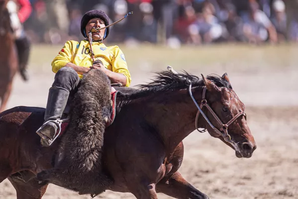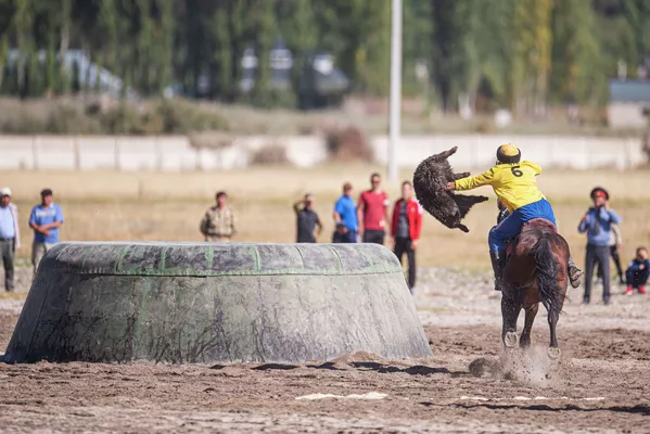 Камчыны тиштеп, эңип алган улагын такымга басууга камданып жаткан Чүйдүн белгилүү улакчысы Рустам Тыналиев. Ал Кыргызстандын курама командасында да ойнойт.