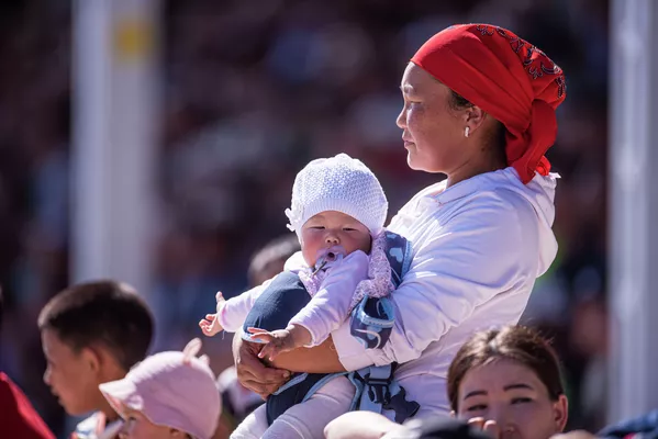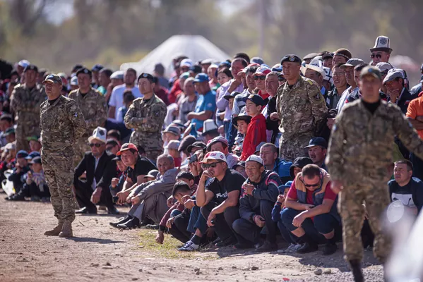Көк бөрүнү көрүүгө жалаң эле эркектер келген жок. Мына минтип бир баласын жетелеп, экинчисин колуна көтөрүп келген аялдар да болду.