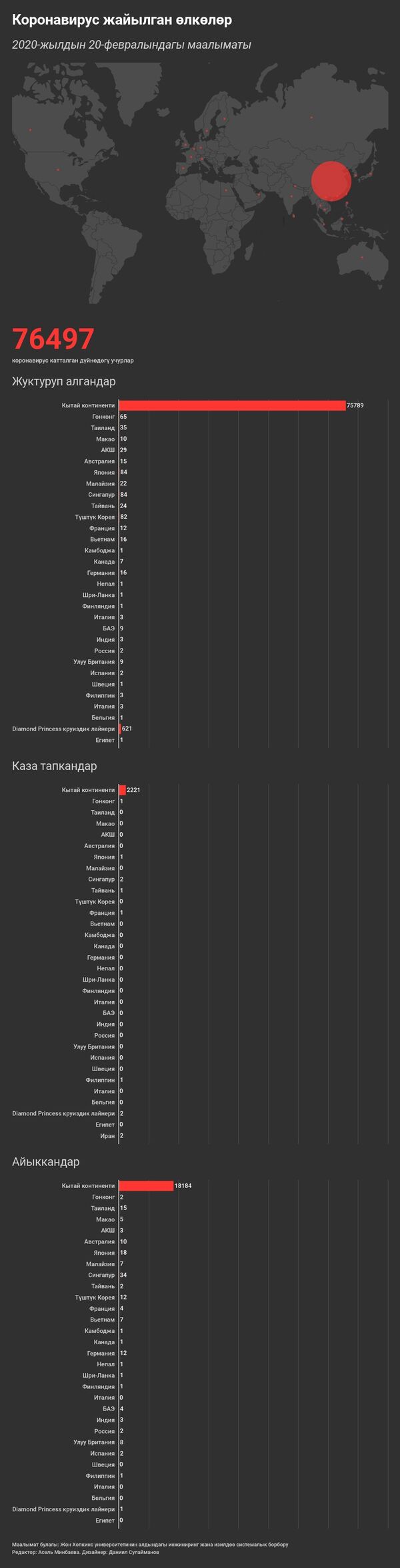 БИШКЕК, 21-фев. — Sputnik. Акыркы маалыматтар боюнча, 76 497 киши COVID-19 коронавирусуна кабылды. Бул боюнча Жон Хопкинс атындагы университеттин Системалуу изилдөө жана инжиниринг борборунун сайтында жазылды.