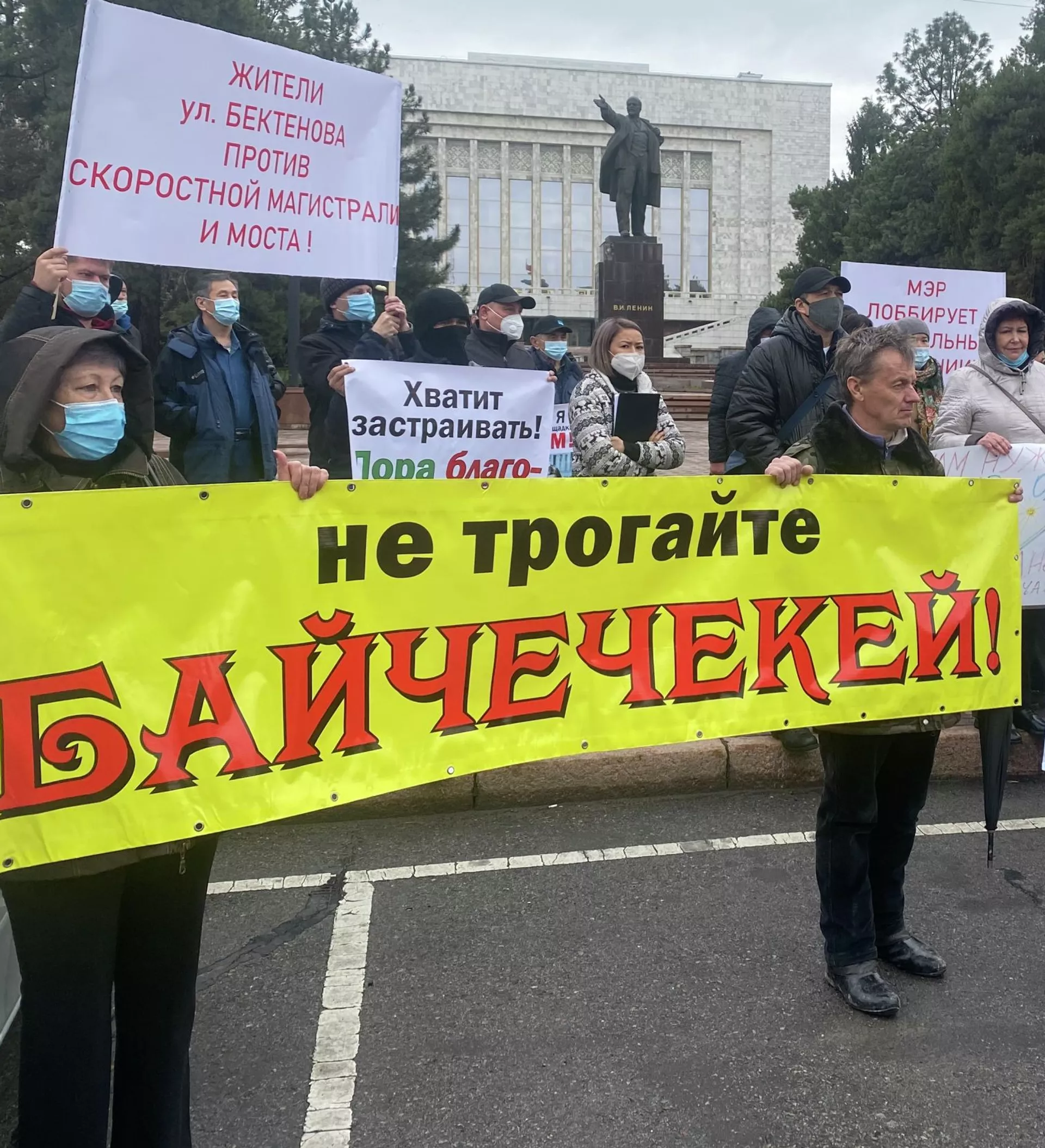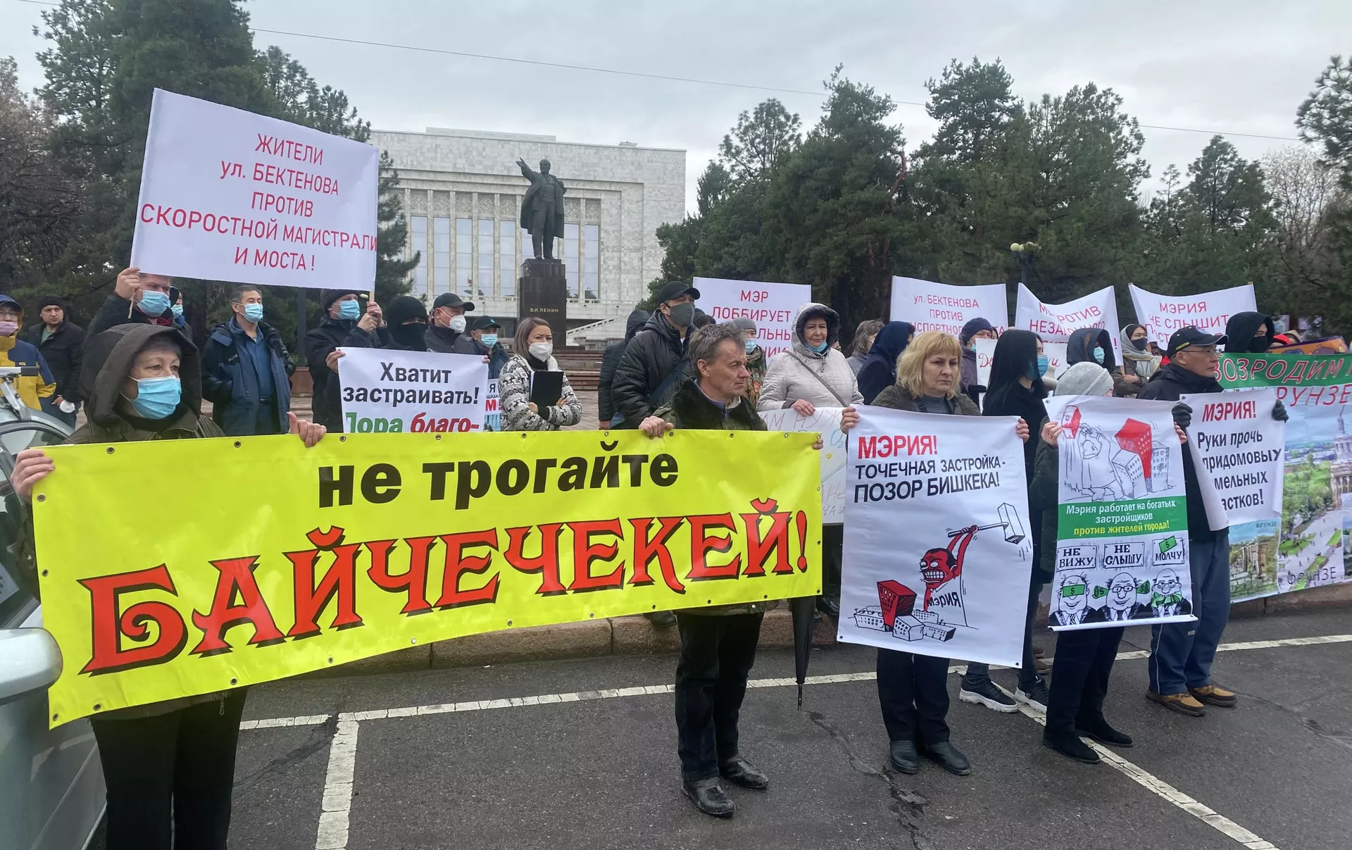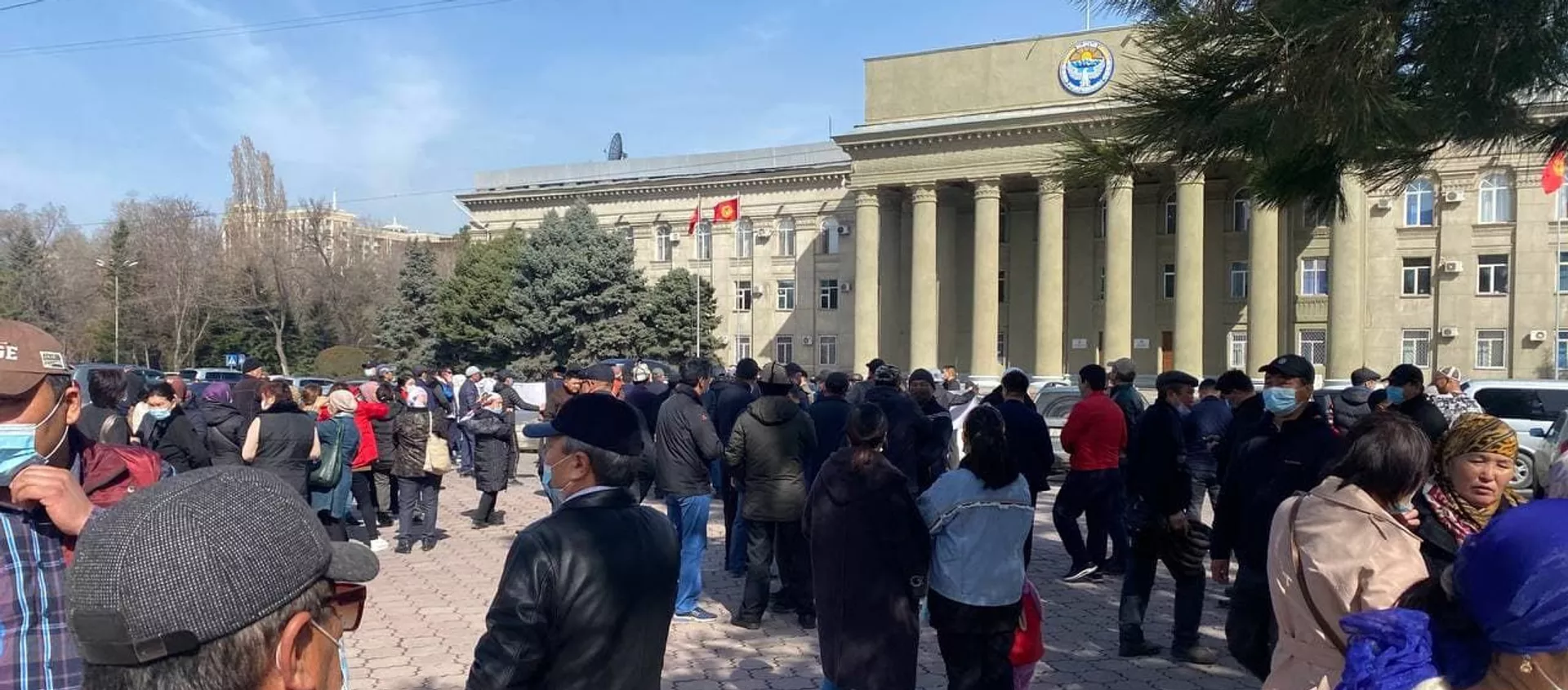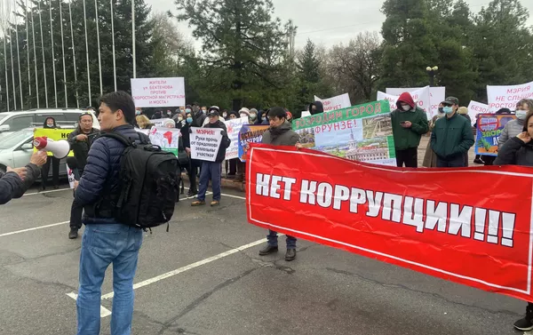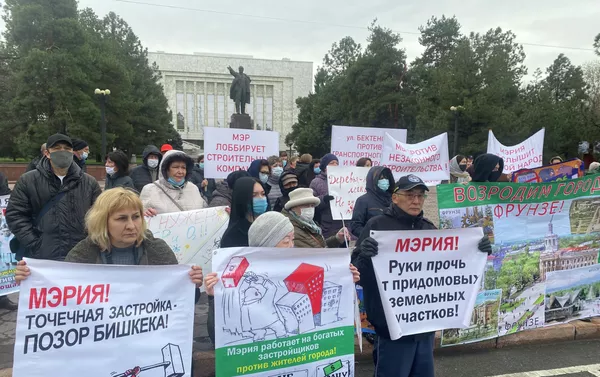 Биринчи митингдин катышуучулары ордо калаада мыйзамсыз салынып жаткан курулуштарга нааразы болуп чыккан. Экинчи митингчилер — профсоюздун өкүлдөрү. 05.04.2021, Sputnik Кыргызстан
