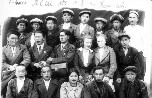 Келечектеги Советтер Союзунун Баатыры Чолпонбай Түлөбердиев (3-катарда оң жактан үчүнчү) классташтары менен. №5 Кара-Сай орто мектеби, 1941-жыл, 8 -май.