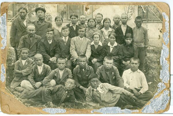 Октябрь орто мектебинин алгачкы бүтүрүүчүлөрү. Алардын арасында Улуу Ата Мекендик согушка катышкан С.Кубатов (5-катарда оң жактан экинчи) бар. Фрунзе облусу, 1938-ж.
