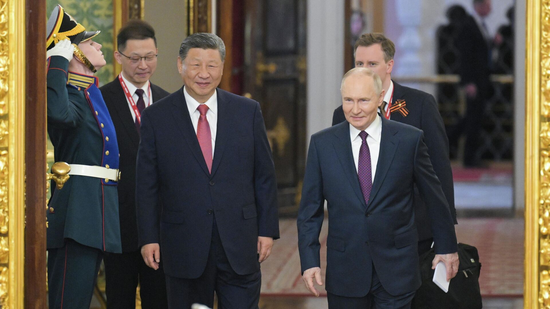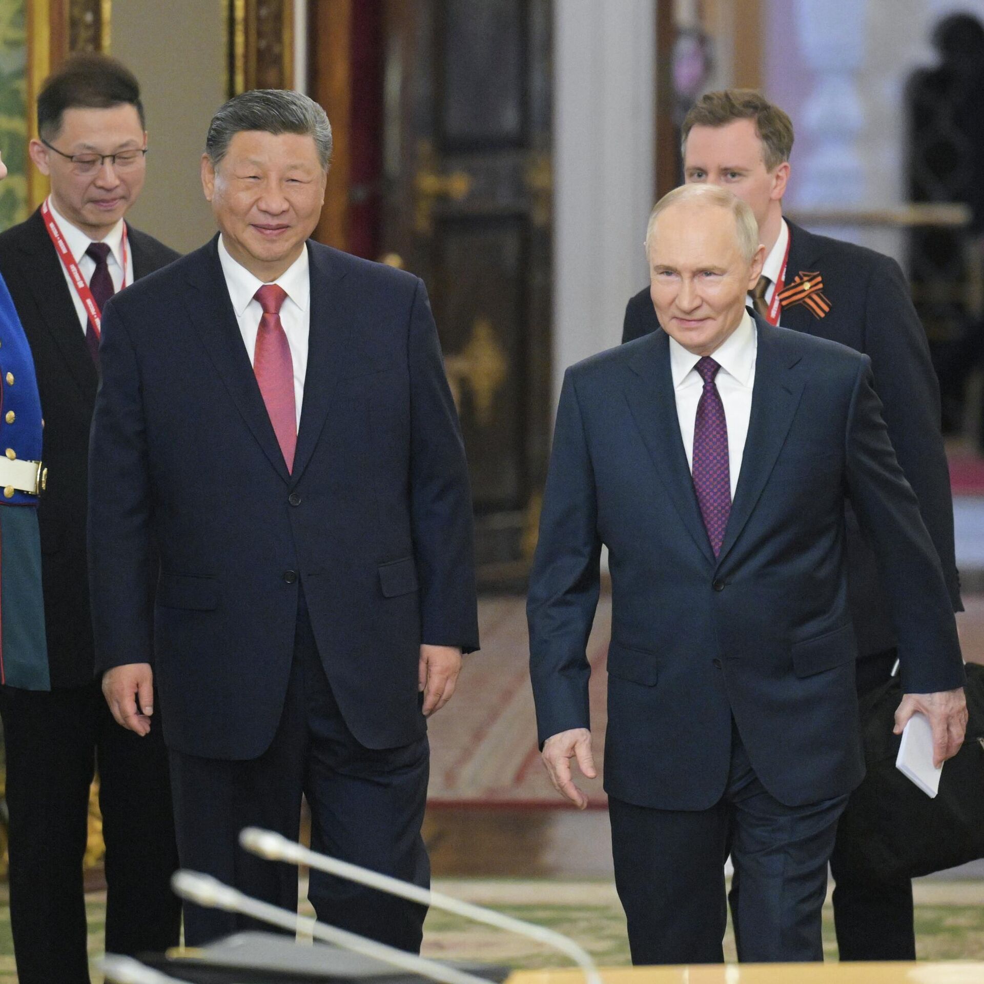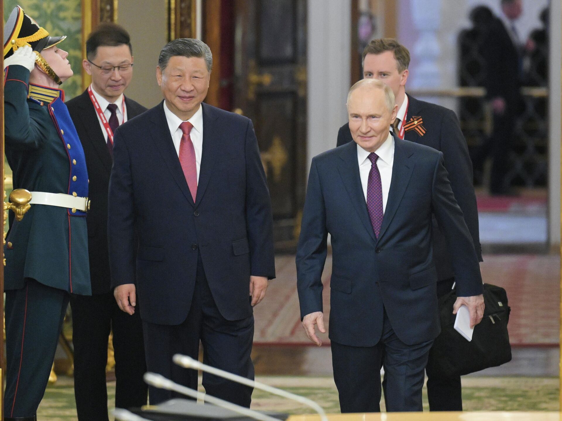 сүйлөшүүлөр башталар алдында Кремлдин Георгий залында Кытай лидерин расмий тосуп алуу аземи болду. Ага Путин менен Си Цзиньпин, ошондой эле орус-кытай делегацияларынын өкүлдөрү катышты;