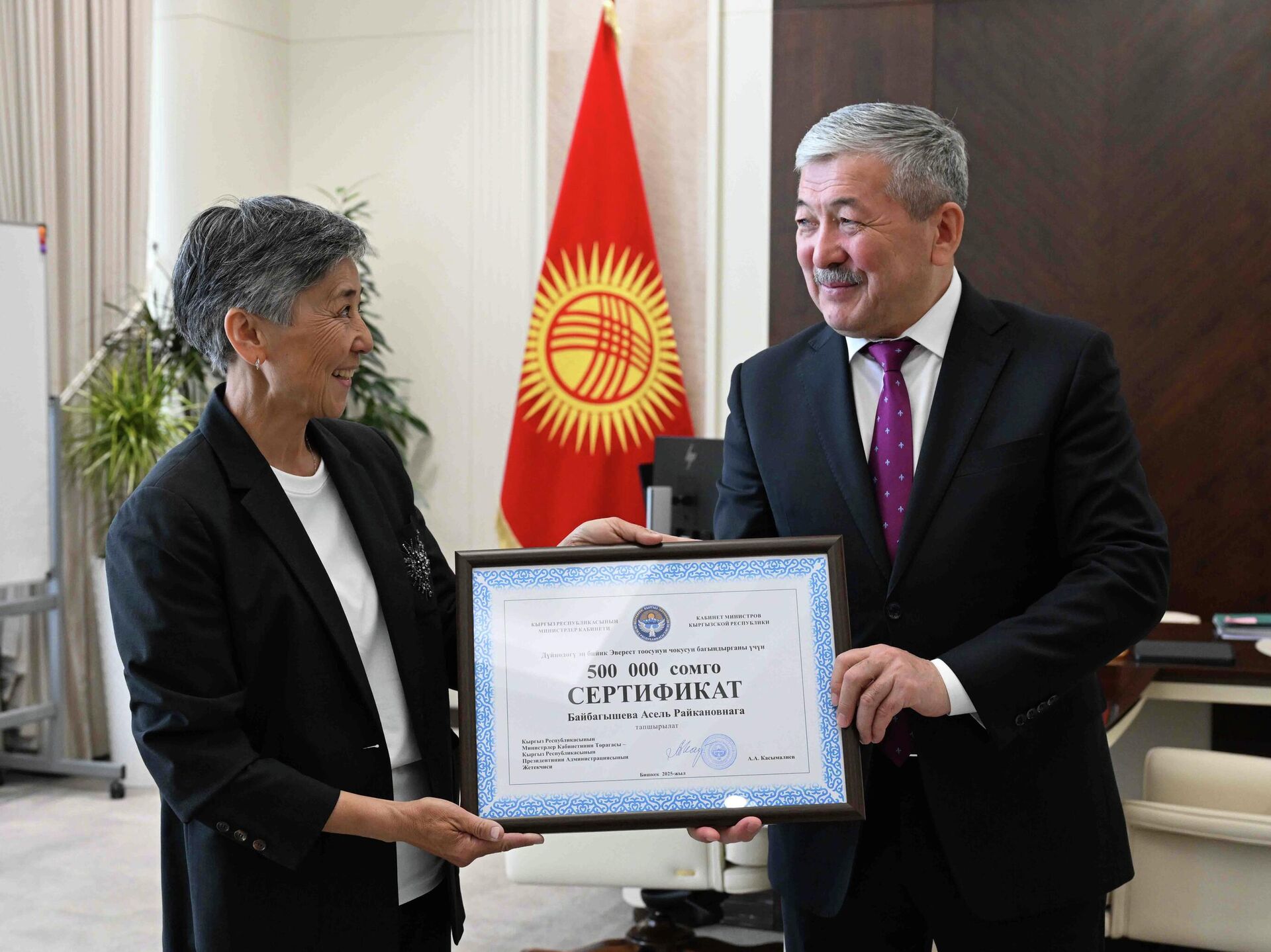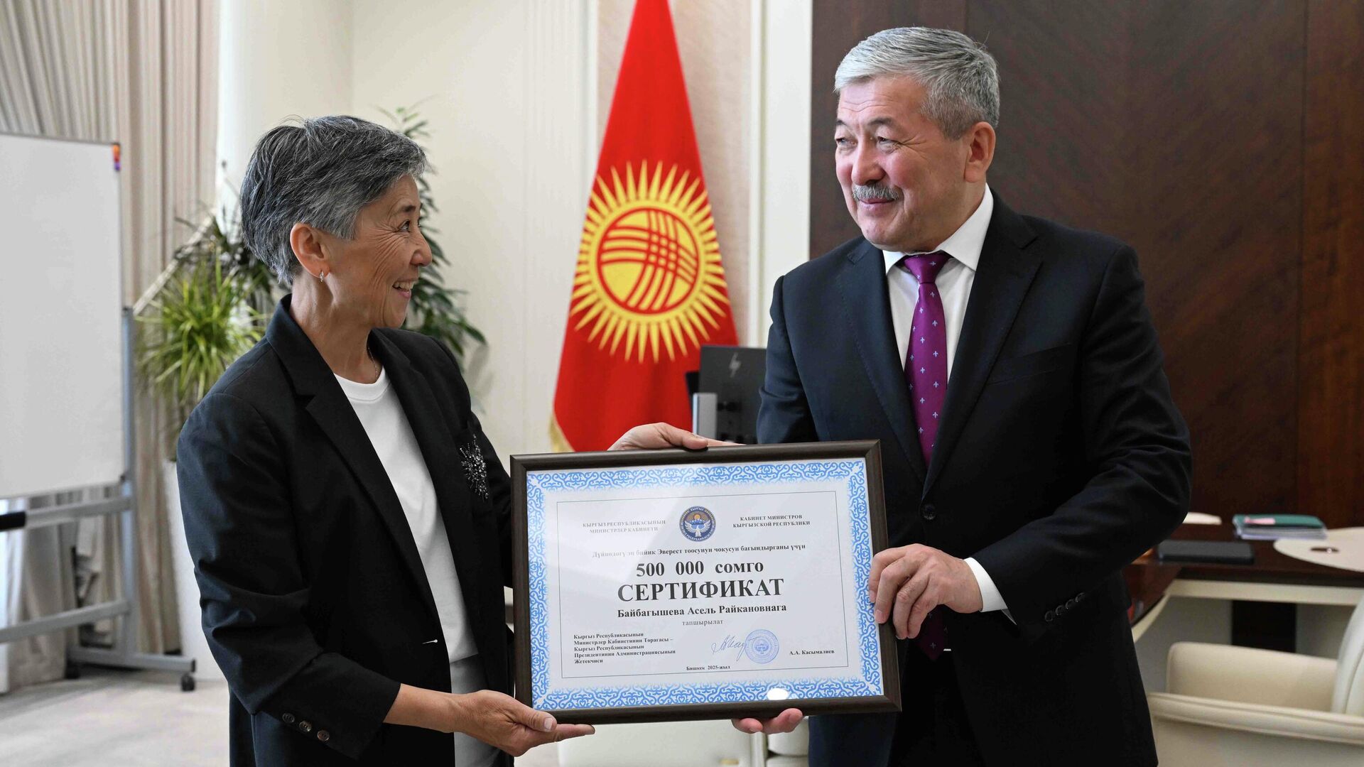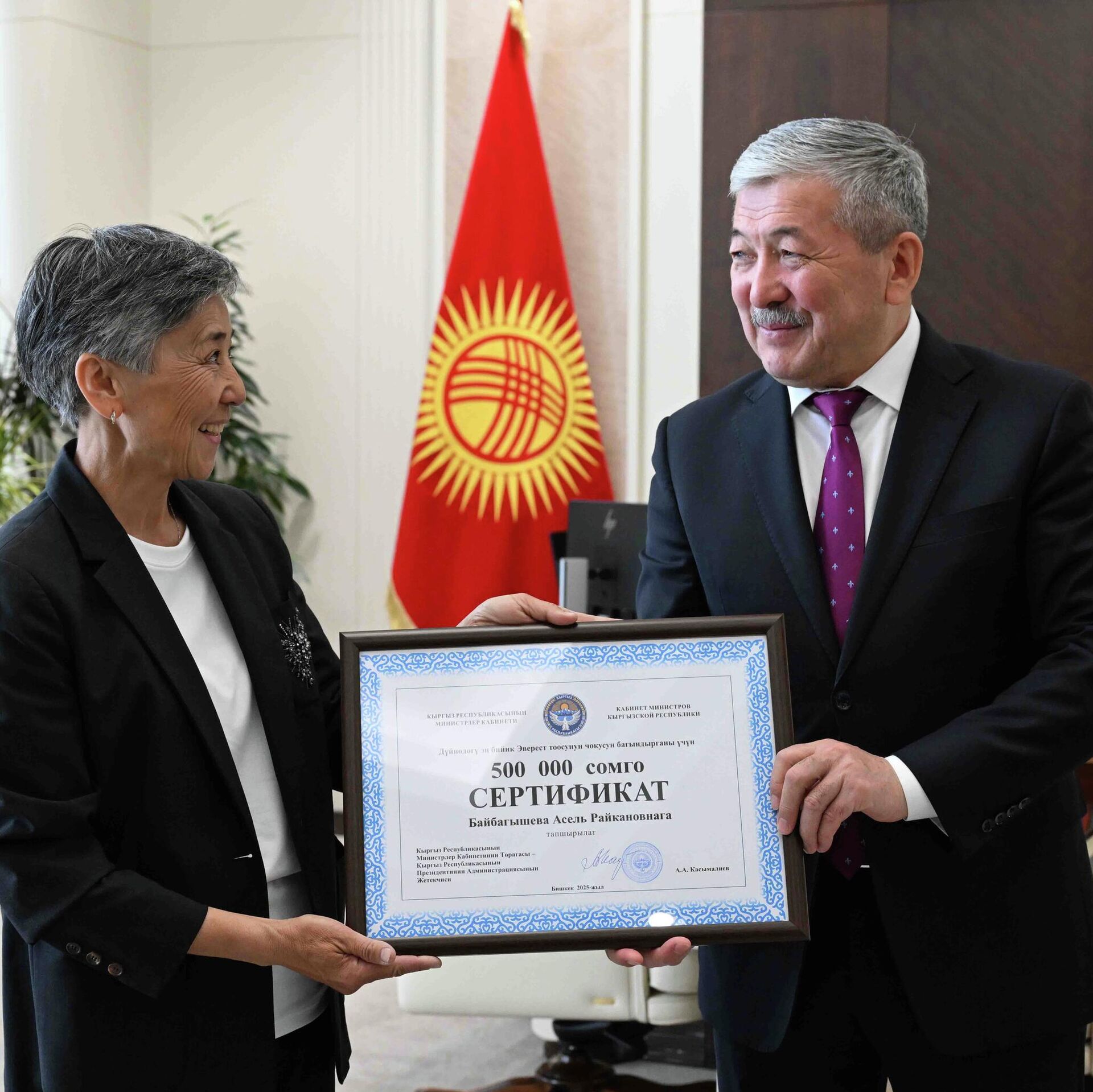 Касымалиев Эверестти багындырган Байбагышевага 500 миң сомдук сертификат берди