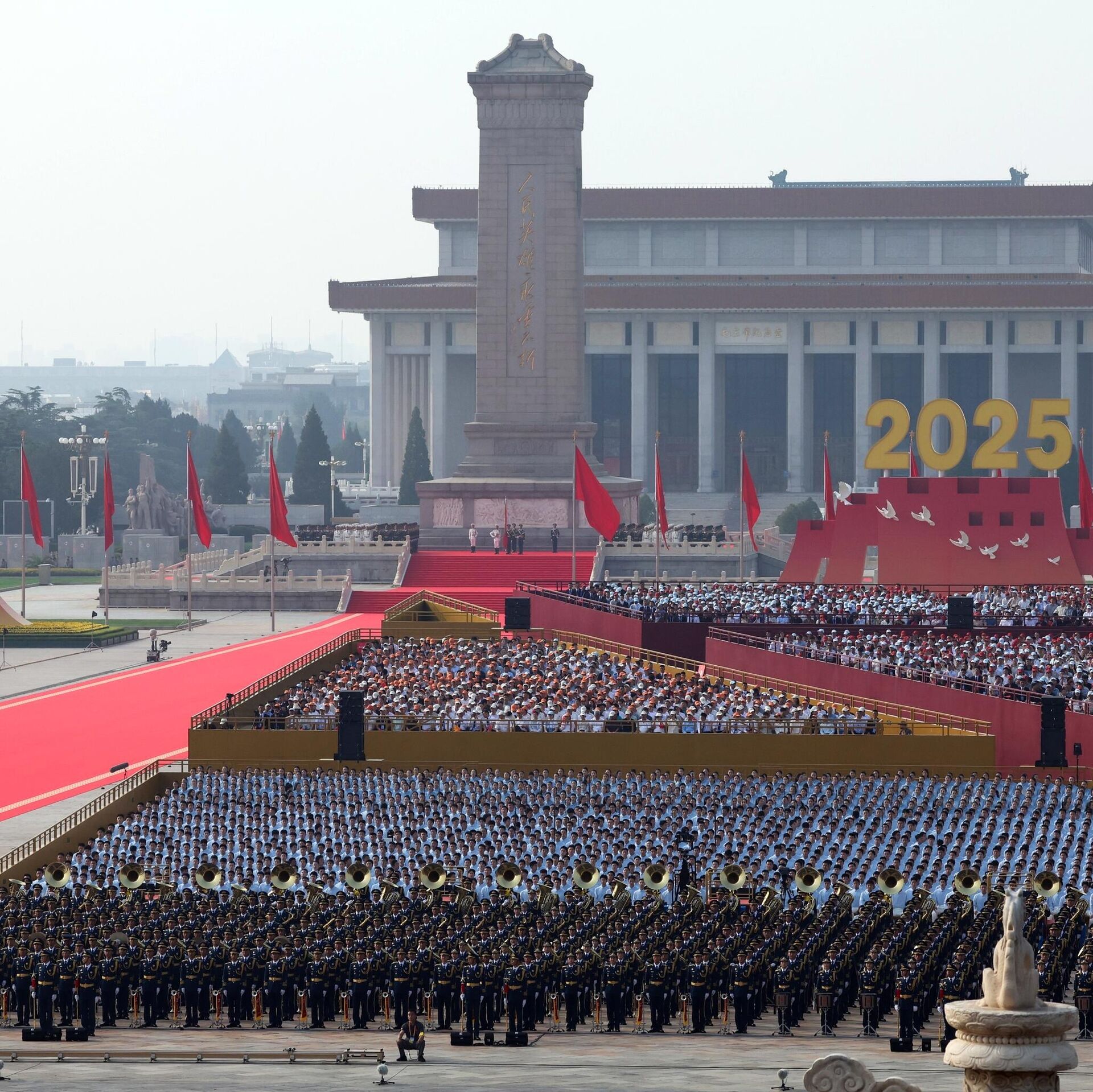 1949-жылы Кытай негизделгенден берки эң ири, миңден ашуун кишиден турган аскердик оркестр. Алар бүгүн аскердик тематикадагы классикалык чыгармаларды жана бул парад үчүн атайын жазылган музыкалык жаңы композицияларды аткарды.
