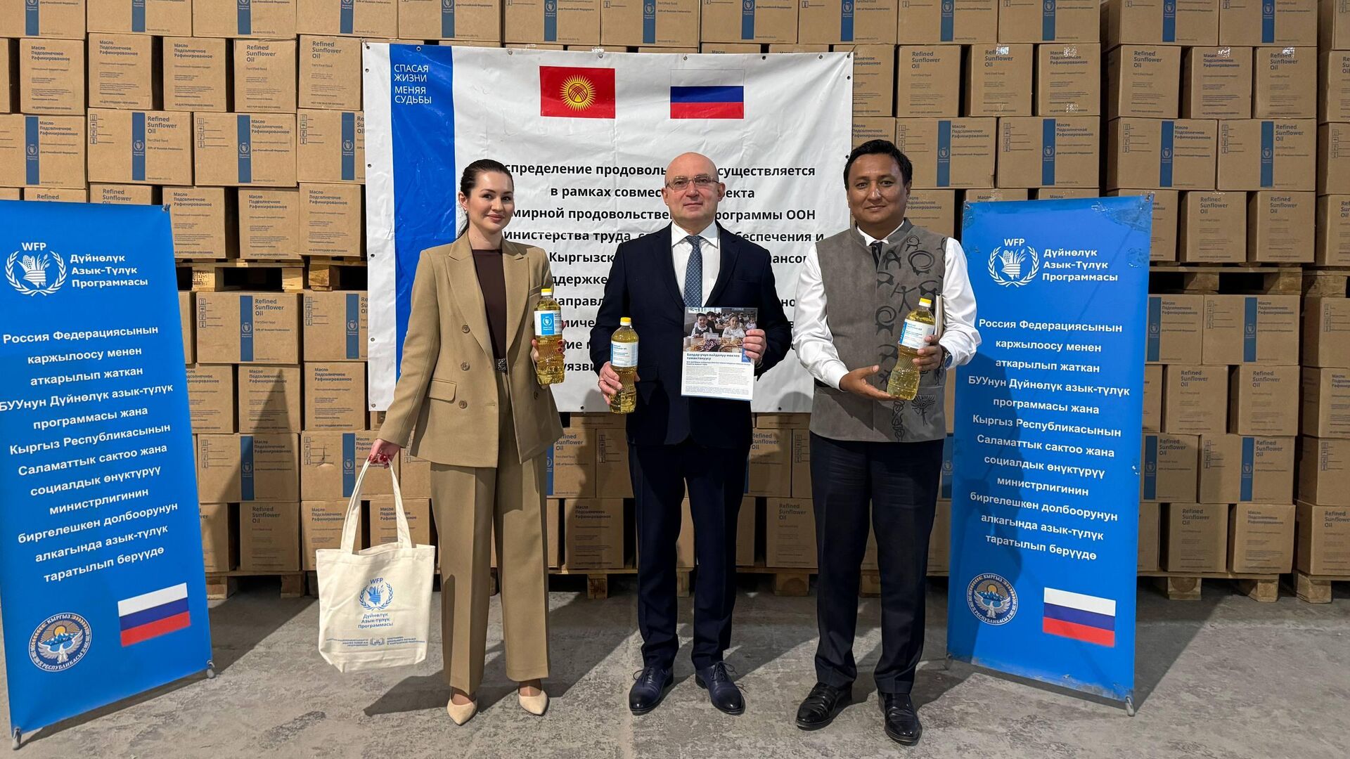 БИШКЕК, 27-окт. — Sputnik. Кыргызстандын түштүк борборуна Россиядан жардам иретинде 121,4 миң тонна өсүмдүк майы келгенин РФтин Оштогу Башкы консулдугу билдирди. Азык-түлүктү тапшыруу салтанатына башкы консулдун милдетин аткарып жаткан Валерий Катункин жана үчүнчү катчы Анастасия Егерева катышкан. Майды БУУнун Азык-түлүк программасынын өкүлдөрү жана жергиликтүү бийлик муктаж бүлөлөргө таратып берет. Россия БУУнун Азык-түлүк программасынын Кыргызстандагы эң ири донору болуп саналат. Акыркы 15 жыл ичинде ар кандай деңгээлде жардам көрсөтүлүп келген. Эскерте кетсек, август айында Кыргызстандын түштүгүнө 16 вагон байытылган ун жана өсүмдүк майы жеткирилген болчу.
