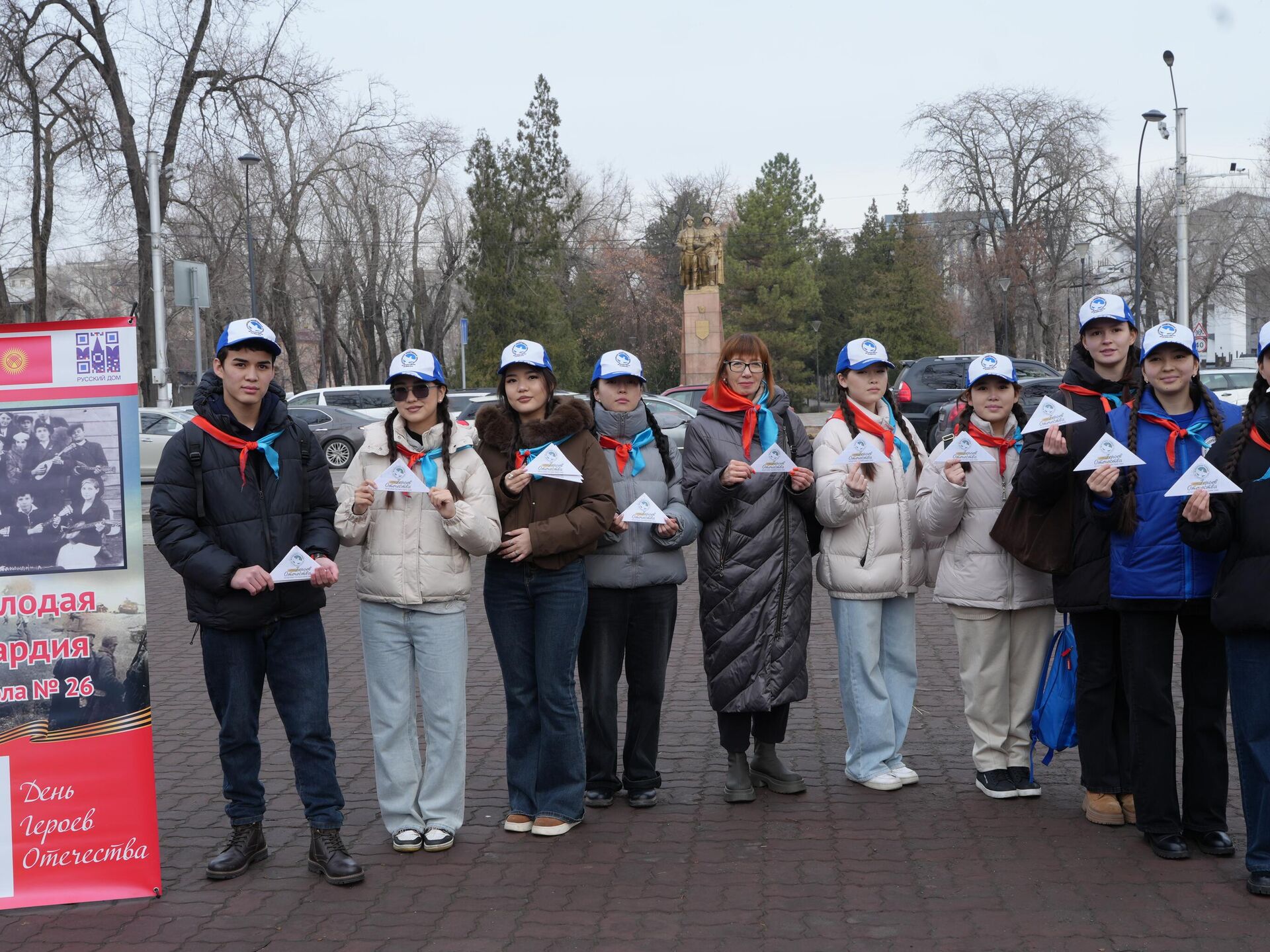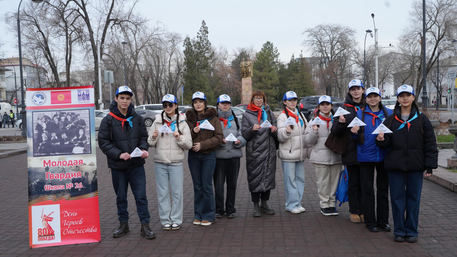 "Жеңиштин ыктыярчылары" кыймылынын катышуучулары Ата Мекендин Баатырлары күнүндө (РФ) Кыргызстандын 16 шаарынын жана айылынын көчөлөрүн кыдырышты. "Жеңиштин ыктыярчылары" мектеп отрядынын жетекчиси Танзиля Саманчинова Sputnik Кыргызстанга берген комментарийинде Жаш Гвардиянын жашыруун уюмунун тарыхы мекенди кантип коргоо керектигинин ачык мисалы экенин белгиледи.