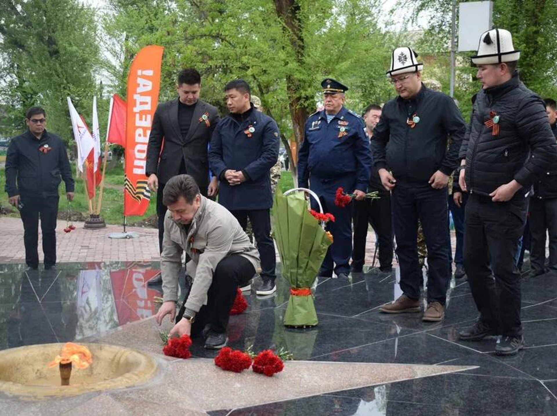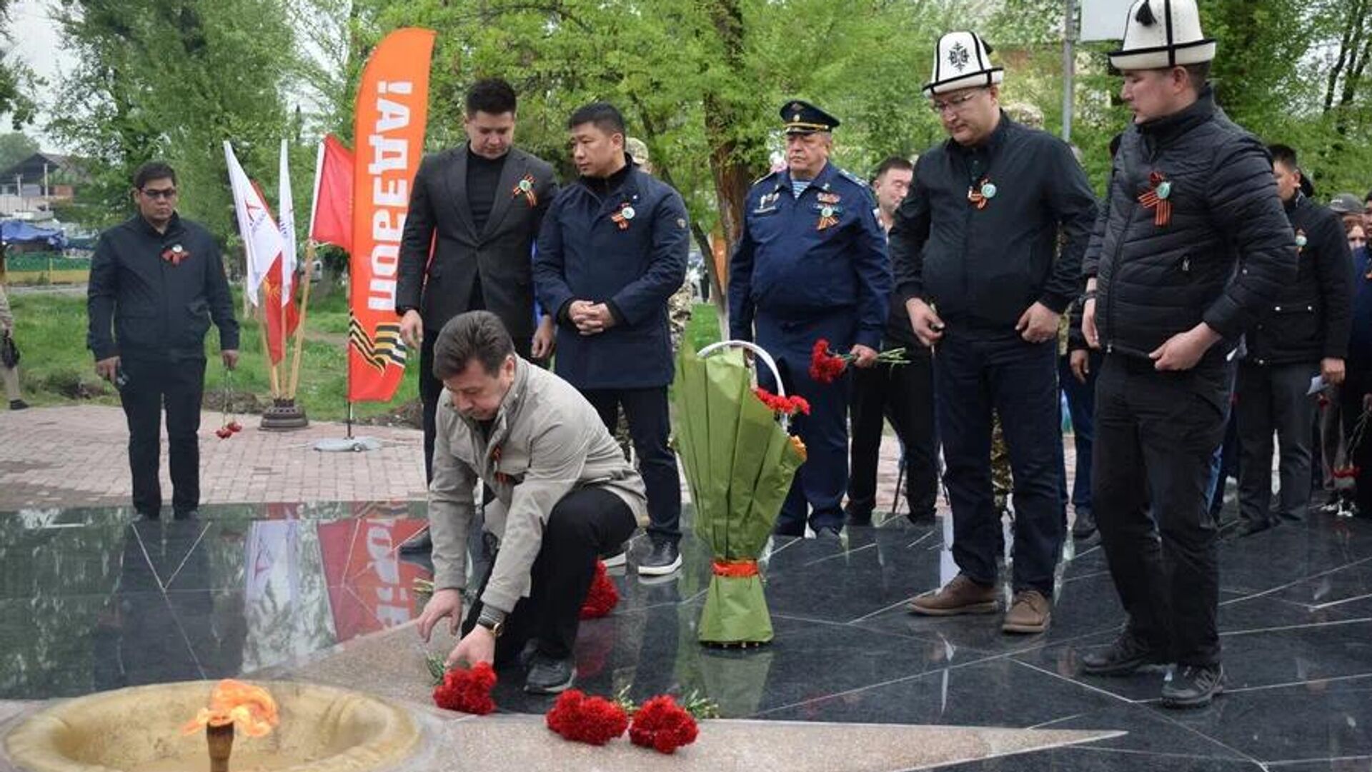 Ага Россиянын Кыргызстандагы элчиси Сергей Вакунов, КМШ өлкөлөрүнүн дипломатиялык мекемелеринин жана жергиликтүү бийликтин өкүлдөрү катышты. РФ элчиси кийики муундарды, жаштарды тарыхты унутпоого, согуш маалында совет эли кандай сыноолорго туш болгонун жана кандай жамандыкты жеңгенин биле жүрүүгө чакырды.