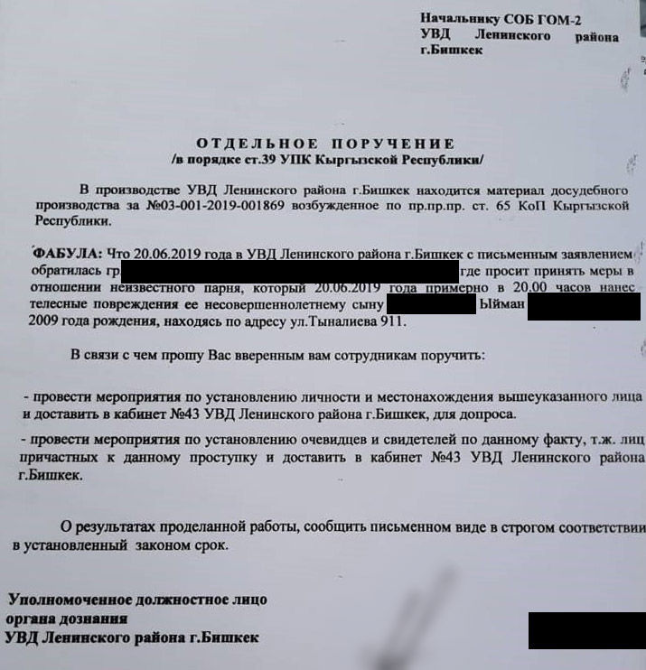 "20-июнда Биринчи Май райондук ИИБге 102 кызматы аркылуу белгисиз адам эки өспүрүмдү сабап салды деген чакыруу түшкөн. Ал жакка оперативдик тергөө тобу барган. Аталган фактыны Бирдиктүү реестрге тергөөчү 20-июнь күнү каттабай калган. Себеби башка да чакыруу чыгып калгандыктан факты реестрге 21-июнь күнү түшкөн. Учурда бул иш боюнча Кылмыш кодексинин 65-беренеси ("уруп-сабоо") боюнча сотко чейинки териштирүү иштери башталды. Соттук-медициналык экспертиза дайындалган", — деди Жумаков.
