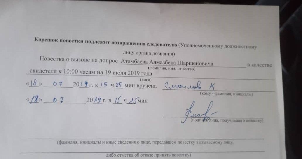 Бүгүн, 18-июлда, милиция кызматкерлери Атамбаевге ИИМге келип сурак берүү үчүн үчүнчү ирет билдирүү катын алып келди. Ал катта Атамбаев 19-июлда саат 10:00дө барышы керек.