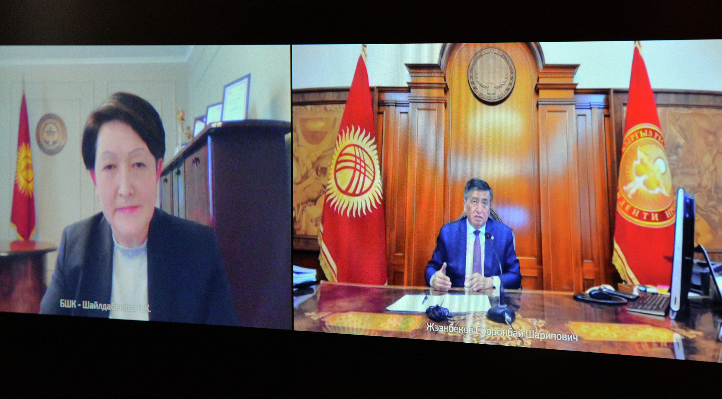 БИШКЕК, 3-июл. — Sputnik. Президент Сооронбай Жээнбеков Шайлоо жана референдумдарды өткөрүү боюнча борбордук комиссиясынын төрайымы Нуржан Шайлдабекова менен онлайн кеңешме өткөрүп, парламенттик шайлоого карата даярдык маселелерин талкуулады. Бул тууралуу өлкө башчынын маалымат кызматы кабарлады.