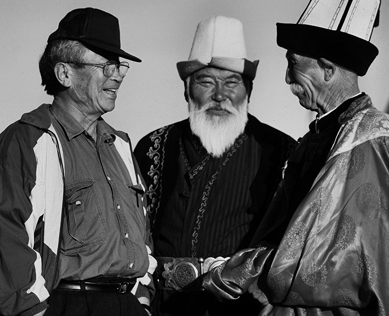 © Sputnik / Александр ФедоровСССР Эл артисти Төлөмүш Океев, Кыргыз ССРинин эмгек сиңирген артисти Орозбек Кутманалиев жана Каба манасчы