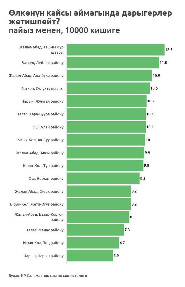 Бул окуядан кийин Sputnik Кыргызстан агенттиги министрликке кайрылып, кайсы аймакта кандай дарыгерлер жетишсиз экенин билип көрдү.
